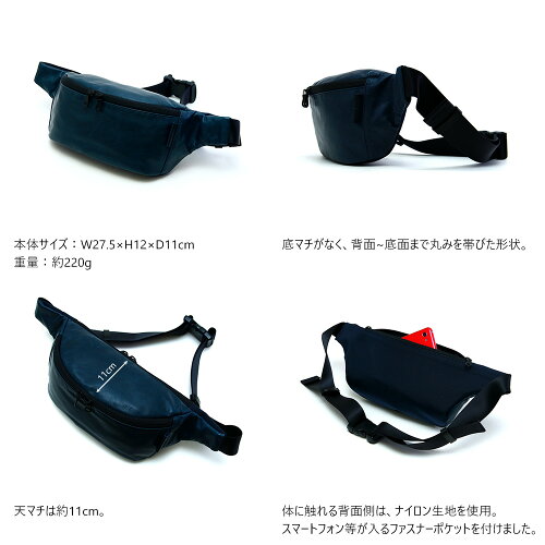 Detail 商品説明 ■素材:馬革 ■サイズ:W27.5× H12× D11(cm) ■重量:約220g 馬革で上品に仕立てたスポーティーなウエスト・ボディバッグです。